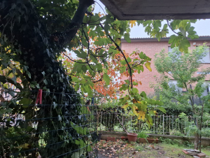 Il giardino di 230 mq. con piante e alberi da frutto è disposto su due livelli